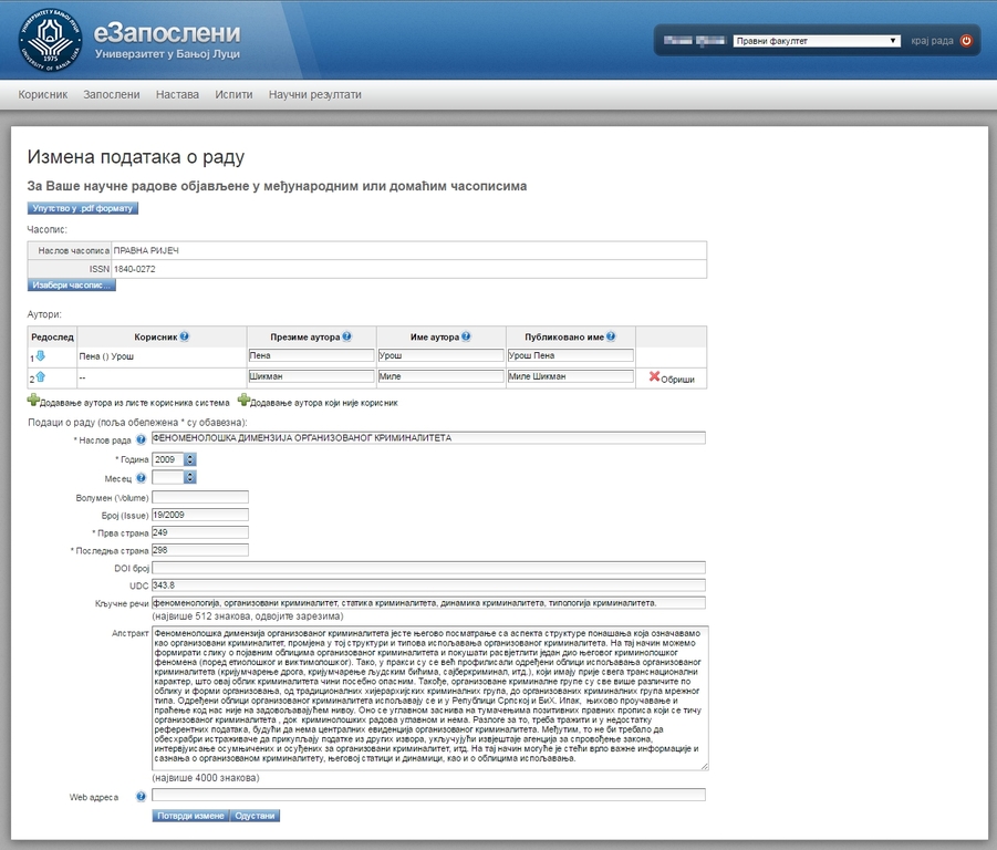 - Unos podataka o objavljenim naučnim radovima;