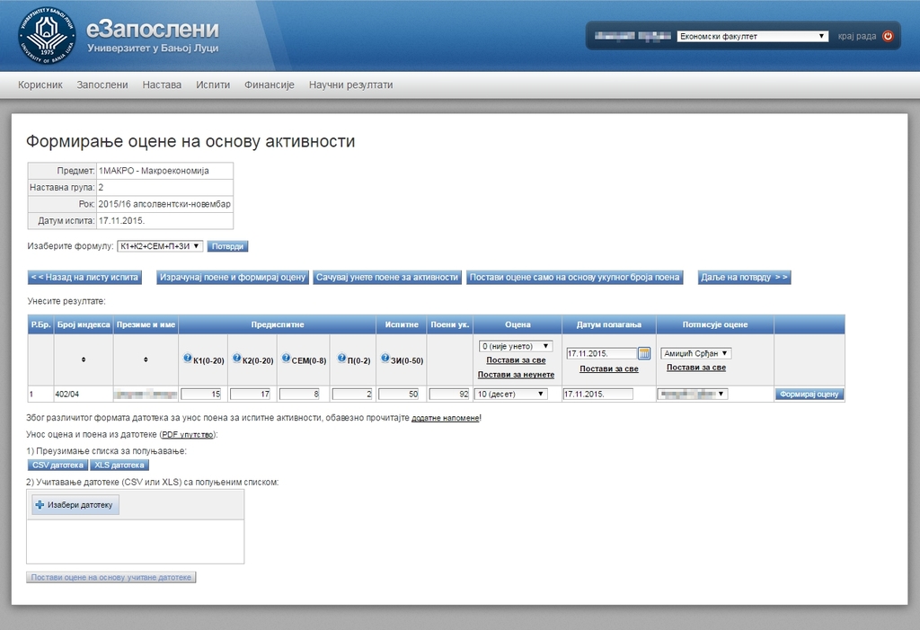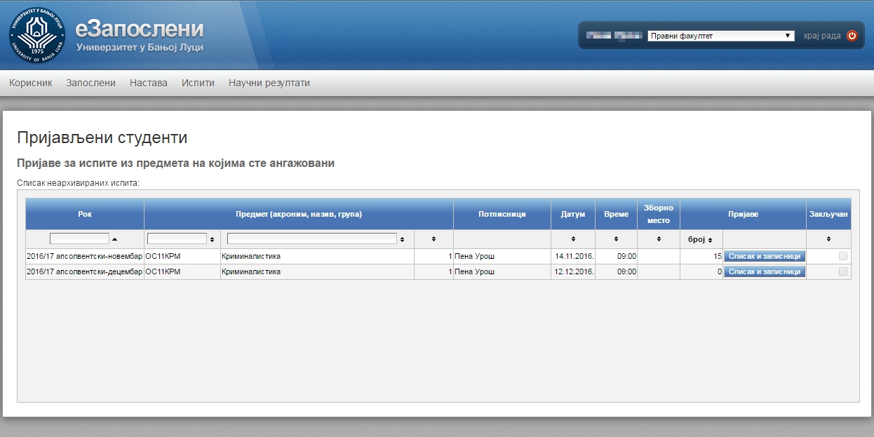 - Pregled i preuzimanje spiska studenata prijavljenih za polaganje ispita (i preuzimanje zapisnika sa ispita);